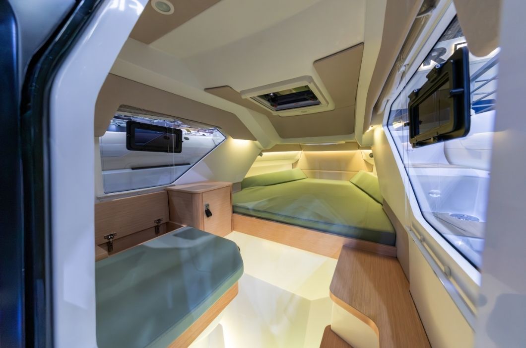 Lo scafo, lungo 9,2 metri, garantisce una presenza importante in acqua senza compromettere la manovrabilità. La larghezza di 3,27 metri contribuisce a offrire stabilità e sicurezza.