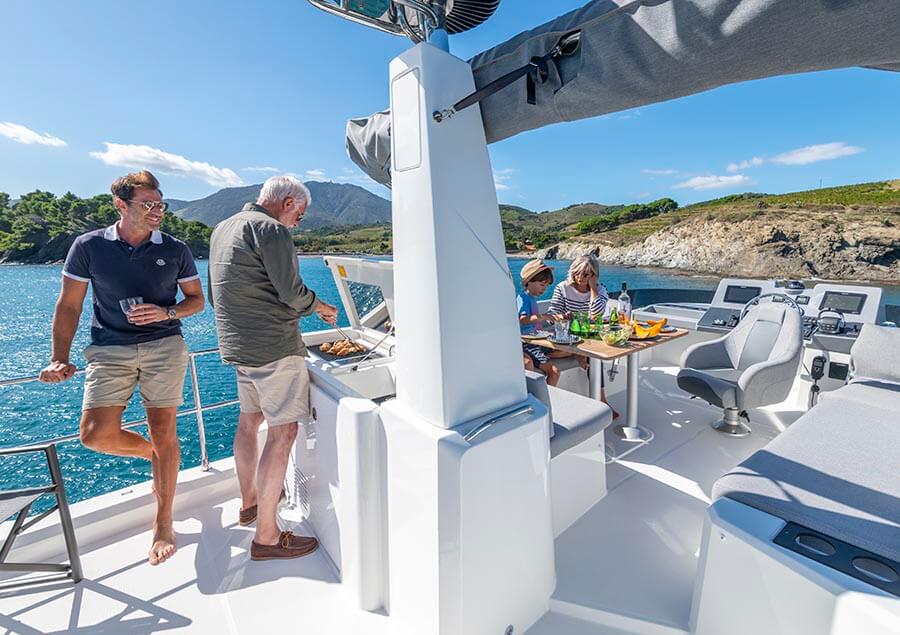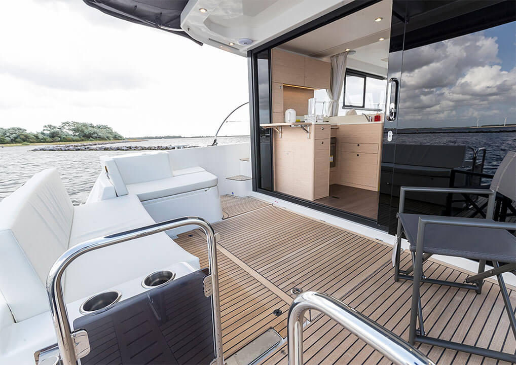 Novità della gamma Swift Trawler : la cucina è posizionata a poppa, in collegamento diretto con il pozzetto.